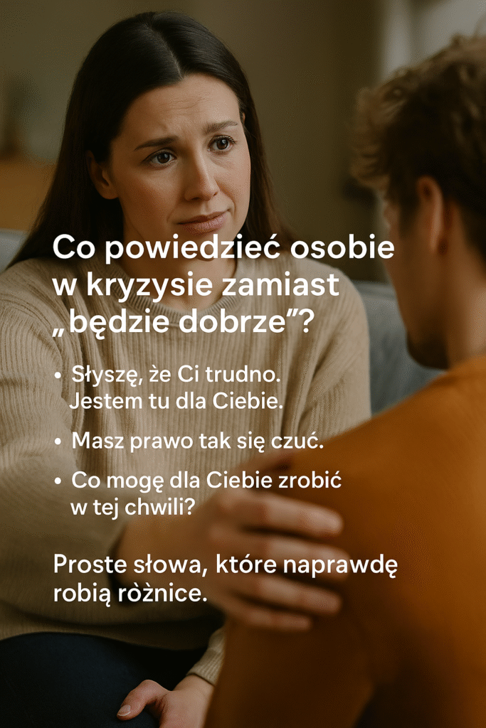 Osoba w kryzysie psychicznym potrzebuje przede wszystkim poczucia, że jej cierpienie jest widziane i zrozumiane. Fraza „będzie dobrze” może sugerować, że: